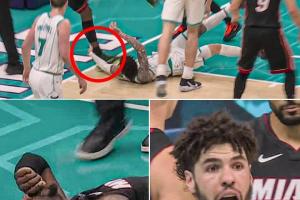 在昨日黄蜂战胜热火的附加赛上半场,拉梅洛·鲍尔倒地后手臂扫到了阿德巴约的脚踝,导致后者受伤退赛。