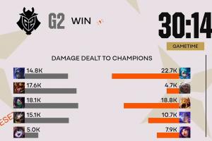体育资讯3月21日讯 今日2026先锋赛G2横扫GenG,而在决胜局中Canyon的狼母仅打出了全场最低的4.7K伤害;还不如G2的辅助露露打的高。