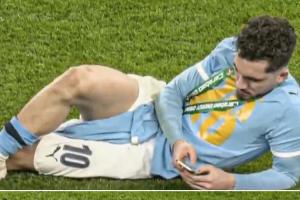 在赛后,曼城球星谢尔基侧躺在球场内玩手机,十分放松。