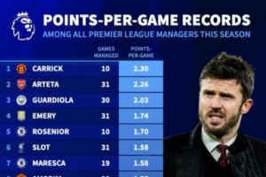 体育资讯3月25日讯 德国转会市场统计了本赛季英超主帅的场均积分(至少执教3场),并列出榜单,卡里克2.3分居首,阿尔特塔2.26分次席。